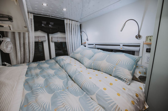 Van #98. Ford Transit Extended. Scout layout. The backsplash anchors the room: Art Deco swans in buttery yellow vinyl, a pattern decision that sets the color language for the entire interior. Gossamer Blue on the lower cabinets, benches, and floor-to-ceiling cabinet face; Sweet Innocence on the upper cabinet faces with Pure White frames; walls flat-painted Pure White throughout. Birch butcher block countertop, clear food-grade oil finish; stainless steel undermount workstation sink with a Sun Spot Polka Dots laminate cutting board that matches the Lagun table top. Satin nickel 5-inch pulls at the lowers. MirroFlex Dome 3 matte white ceiling; LONCOIN Moonstone speckled vinyl underfoot. Rumba Smoke bench cushions. Nude Beach curtains with yellow decorative button closures that echo the backsplash. Fixed shower: MirroFlex Metal Plates brushed stainless on the feature wall, matte white on the side walls, Nautilus brushed nickel door with opaque stripes. Built for what comes next.